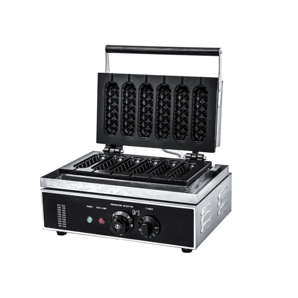 Професионален гофретник за хотдог – 6 броя е ефективно решение за приготвяне на атрактивни хотдог гофрети в ресторанти, кафенета, павилиони и обекти за бързо хранене. Уредът превръща стандартния хотдог в златиста и хрупкава гофрета само за няколко минути, като допринася за разнообразяване на менюто и повишаване на продажбите. Специално проектираната матрица пасва идеално на стандартни хотдози и осигурява равномерно разпределение на тестото без празнини. Формите са изработени от висококачествена алуминиева сплав с отлична топлопроводимост за бързо и равномерно изпичане. Вътрешността остава мека, а външната част – хрупкава и златиста. Незалепващото покритие предотвратява залепване и улеснява почистването, което е особено важно при интензивна работа. Уредът е надежден, лесен за поддръжка и подходящ за създаване на ефектен продукт, който привлича вниманието на клиентите.