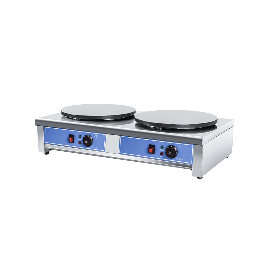 Двоен котлон за палачинки е професионално оборудване за бързо и ефективно приготвяне на палачинки в сладкарници, ресторанти, заведения за закуска, вериги за бързо хранене и мобилни сергии. Двойната нагревателна плоча позволява едновременно приготвяне на палачинки и осигурява висока производителност при натоварен работен процес. Регулируемият термостат с диапазон от 50°C до 300°C позволява прецизен контрол на температурата според различните рецепти и видове тесто. Незалепващото покритие предотвратява залепване и улеснява почистването, като намалява необходимостта от мазнини. Корпусът от неръждаема стомана осигурява устойчивост на корозия, здравина и дълъг експлоатационен живот. Високоефективните нагревателни елементи гарантират бързо загряване и равномерна температура по време на работа, което прави уреда надежден избор за професионални кухни.